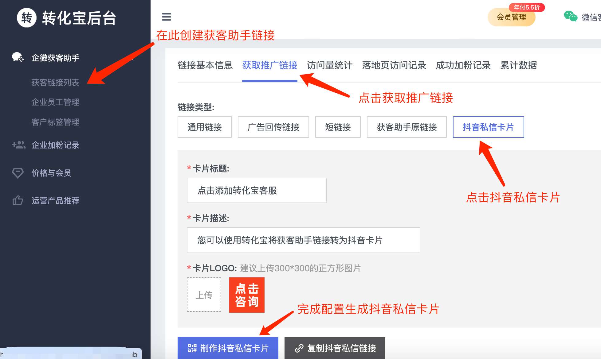 转化宝是一款功能强大的第三方工具,它不仅支持将获客助手转化为抖音私信卡片,还具备获客助手内测申请、链接管理、客户自动打标签等多种功能。使用转化宝制作获客助手卡片的步骤非常简单:登录转化宝后台,创建获客助手链接,进入链接详情页面,点击获取推广链接,填写卡片内容,最后点击生成卡片即可。首次使用苹果手机扫码制作,后续安卓苹果手机均可使用。通过这种方式生成的卡片,封面、标题、描述等都可以自定义,能够更好地吸引用户点击。