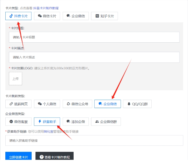 小狐卡片是专业的抖音、微信图文卡片生成平台,适合那些不想使用转化宝管理客服链接、没有查看统计以及广告回传需求的用户。使用小狐卡片制作获客助手卡片的流程也很便捷:打开小狐工具箱官网,登录账号后进入控制台,选择创建卡片,选择抖音卡片类型,根据提示填写相关内容,即可成功创建卡片;首次使用苹果手机扫码制作,后续安卓苹果手机均可使用。