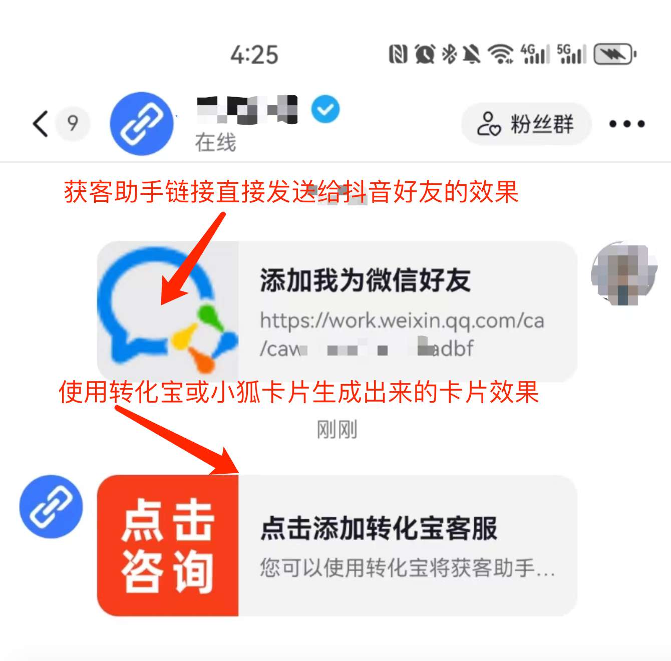 如果您使用获客助手直接发送给抖音私信或群聊时会提示 添加我为微信好友 ,这种展示效果可能不友好;您看看使用转化宝或者小狐卡片转化后的链接效果。卡片封面、标题、描述都可以自定义。