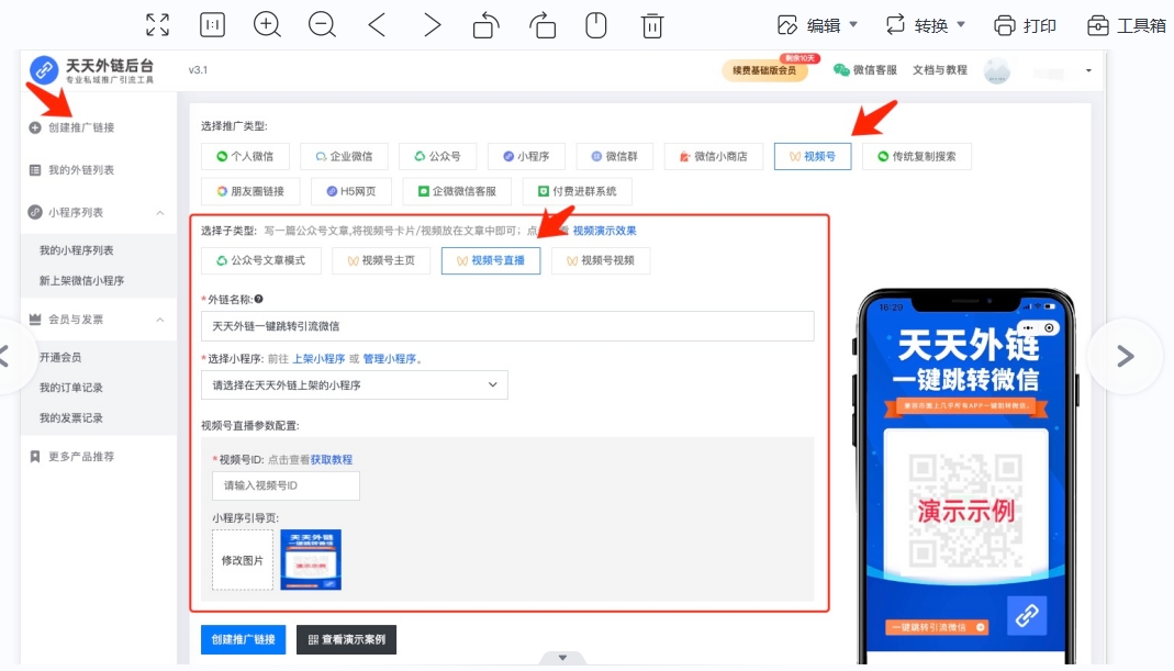 创建外链:登录后,进入后台管理系统,点击创建推广链接,选择推广类型为视频号,根据页面提示填写一些必要的信息如标题、描述等。这些信息将帮助系统更好地识别和管理你的链接。