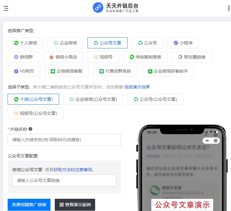 进入后台后,找到“创建推广链接”功能按钮,点击进入。在推广类型中选择“公众号”,然后填写相关信息,比如公众号的名称、文章链接等。