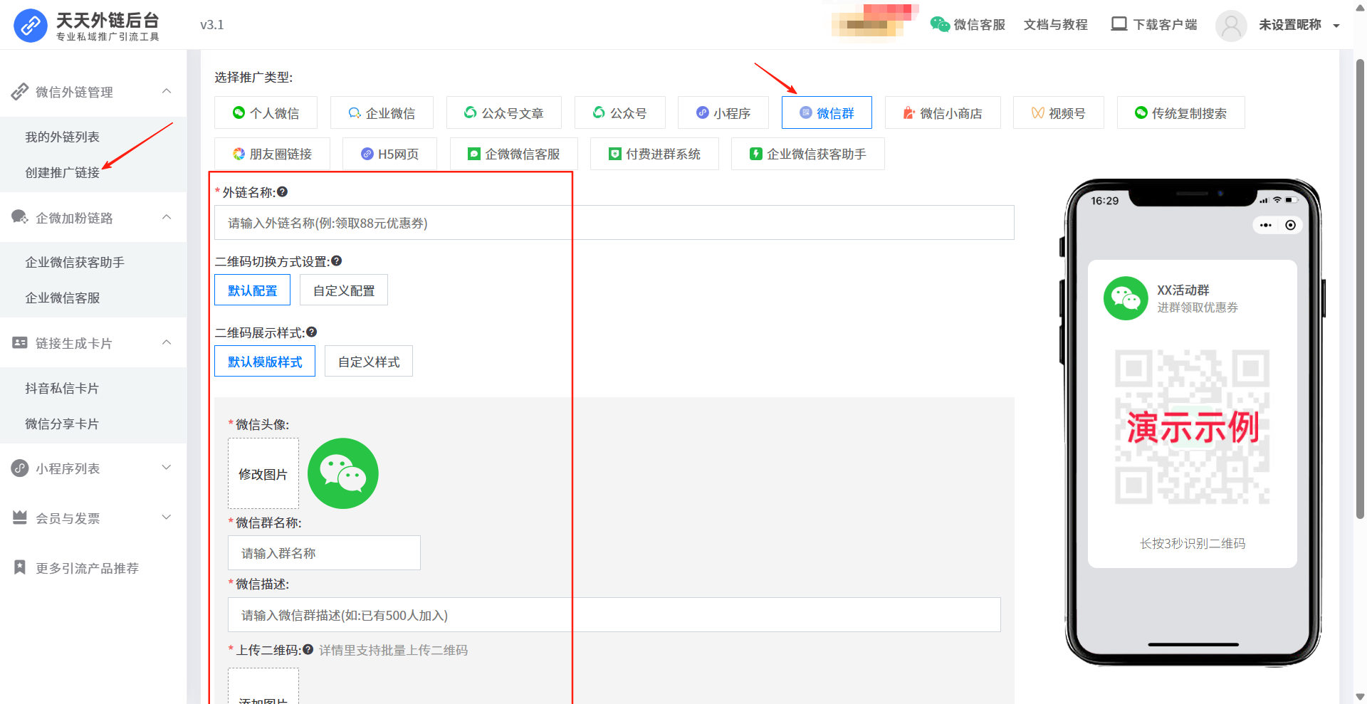 点击“创建推广链接”,进入配置页面。选择跳转目标“微信群”,根据提示上传对应的群二维码图片,引导用户入群互动。同时可自定义外链名称、设置二维码切换方式,并上传头像、填写名称与描述信息,搭配吸引人的引导文案与推广海报,有效提升点击与识别率。