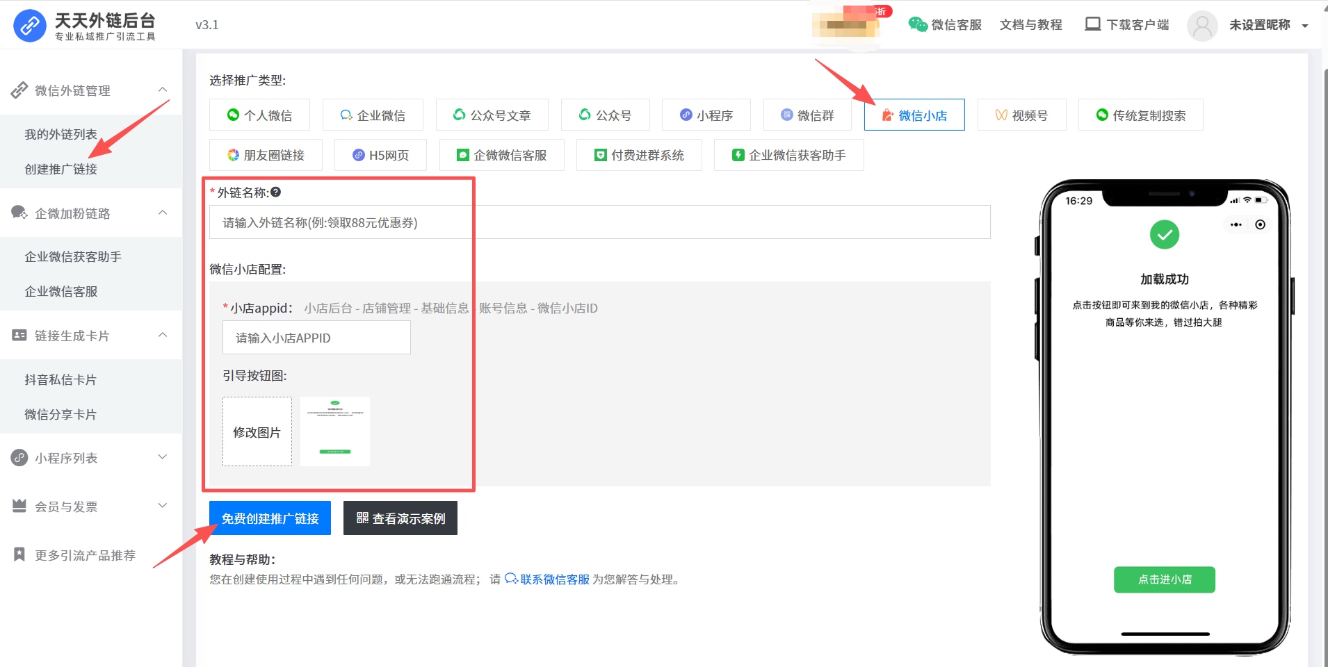 在天天外链后台选择“微信小商店”为目标,填入商品链接即可生成专属跳转链接。平台支持多商品设置,满足不同推广活动需求。