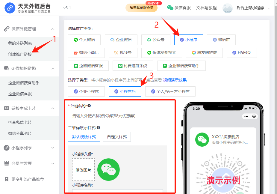 点击创建推广链接,可选择跳转至个人微信、企业微信、公众号、小程序等多种场景。以生成小程序跳转链接为例,可选择默认模式,设置展示头像、名称、描述并上传小程序码;或选择自定义样式,直接上传已包含小程序码的定制海报。已开发小程序的用户还可授权绑定自有小程序,通过审核后直接选用。