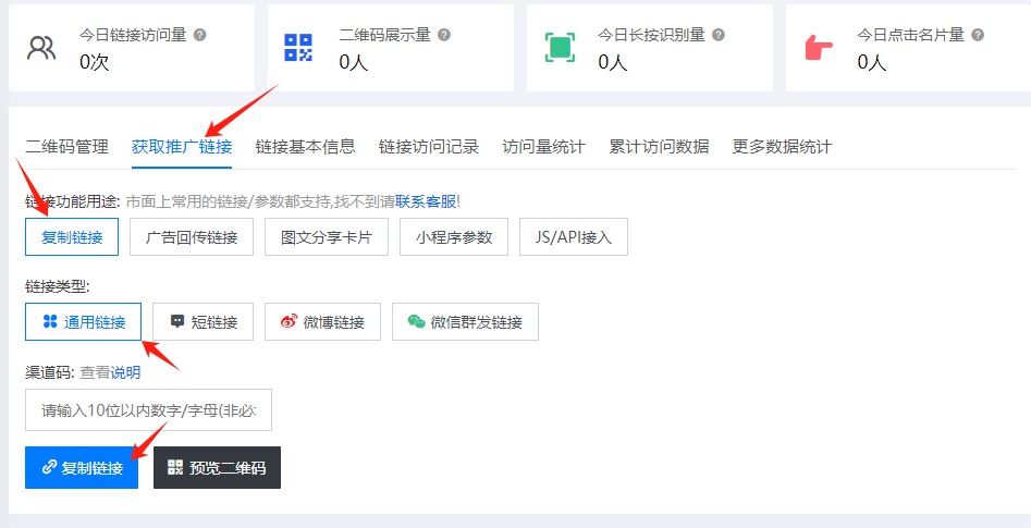 2. 配置链接信息:进入工具后台,找到“创建链接”模块,填写跳转配置信息,先输入目标微信号或上传微信二维码,最后为链接设名称或备注,过程简单,无需技术背景,仅需几分钟。