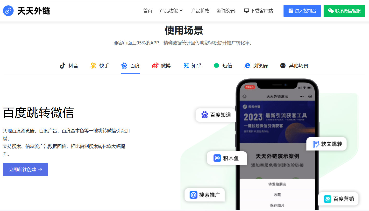 跨平台引流实践中,企业常面临百度落地页流量难导入微信生态的困境,操作繁琐、技术壁垒及链接不稳定影响用户转化与沉淀效率。天天外链提供专业解决方案,其智能跳转技术可实现百度到微信一键直达,配备完善数据追踪系统,让运营者掌握流量来源与转化路径,还内置动态防封机制,通过智能技术规避拦截,确保引流链路畅通。