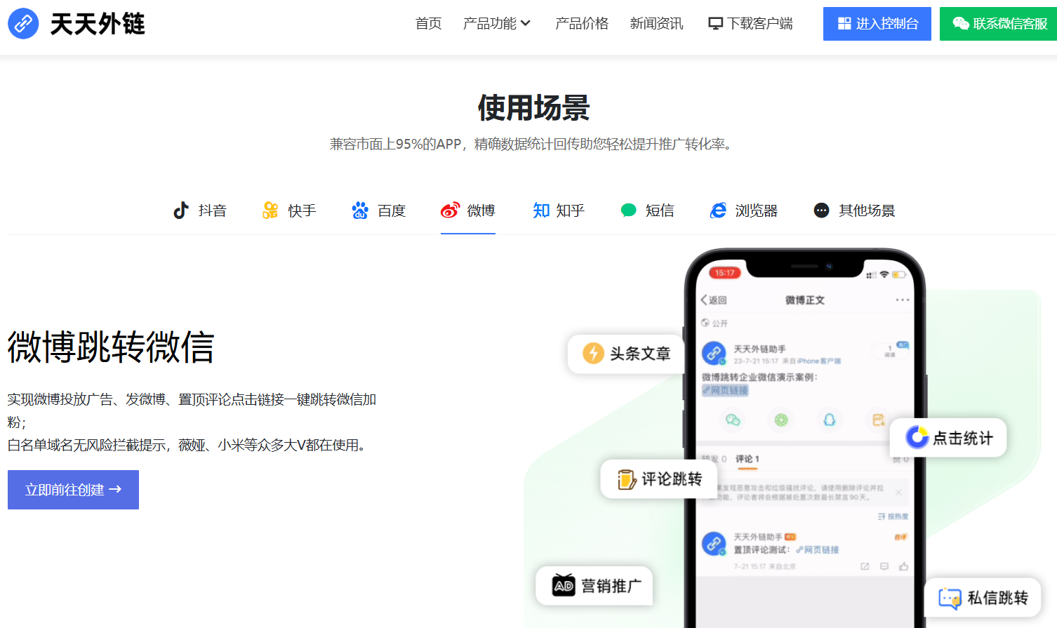 在微博引流过程中,很多运营者都受困于平台壁垒,无法将公域流量高效引导至微信小程序完成转化。天天外链作为专业跨平台引流工具,可完美解决这一痛点,其核心功能包括生成微博兼容的专属跳转链接、提供实时数据追踪统计、支持智能防封保障链接稳定,还能自定义引导页样式,轻松实现微博跳转微信小程序,打通公域引流到私域转化的关键通道。