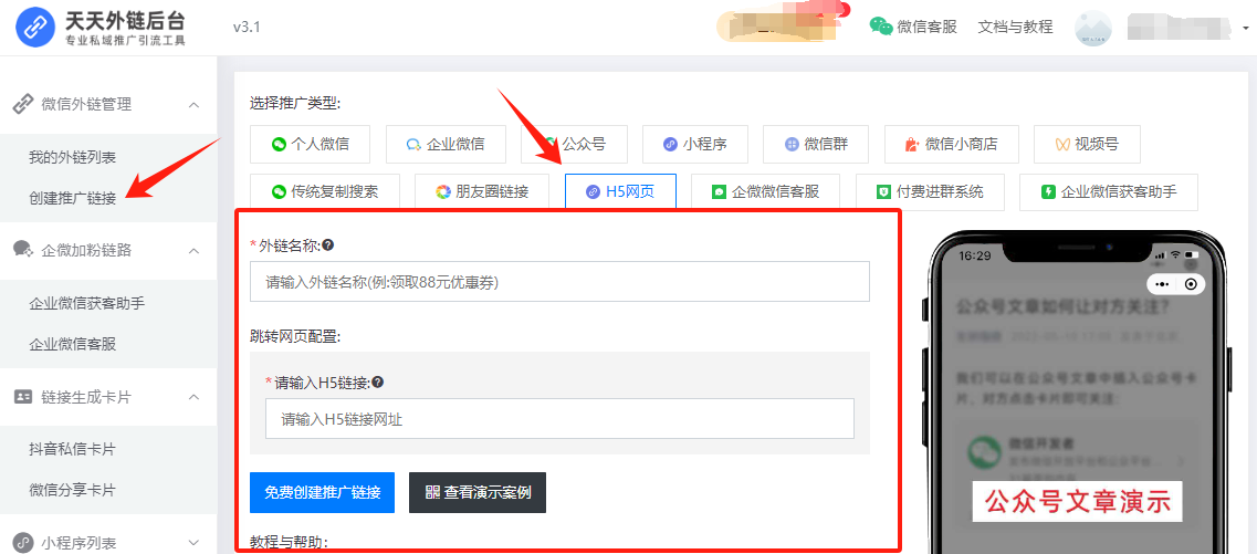 第一步,登录天天外链 https://moreqifu.com/product/ttwl 后台,点击“创建推广链接”,在类型选项中勾选“H5网页”;