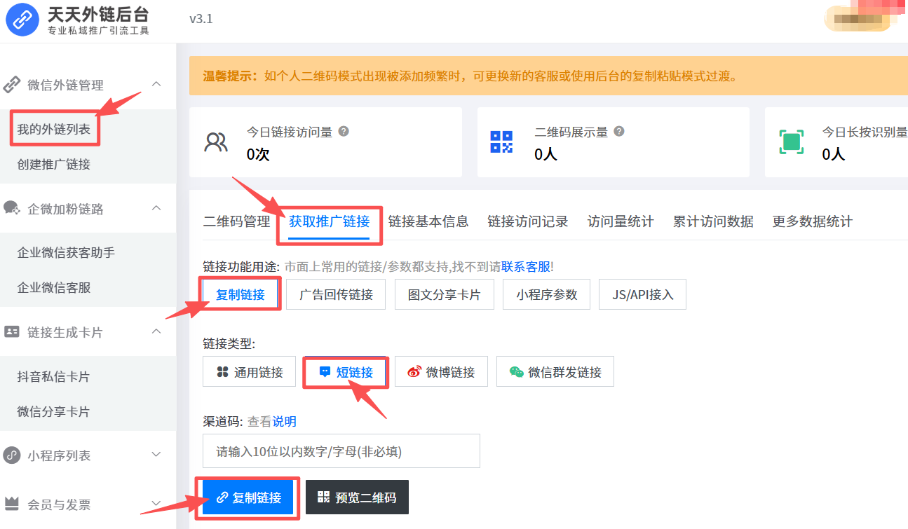 短信营销虽有高到达率优势,但纯文字形式单调、跳转路径冗长(复制链接 - 打开浏览器 - 搜索),易致用户中途流失。解决此痛点需借助“天天外链”等专业跳转工具。它支持链接一键直达微信公众号主页,有智能防封技术保障链接在各短信通道稳定存活,后台还提供精准点击数据统计,能让你掌握短信群发转化效果,实现从“短信触达”到“微信沉淀”的无缝衔接。